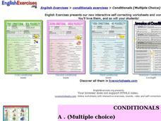 Hop on the Internet for this online, interactive worksheet. There are two exercises provided relating to the use of conditionals. The first exercise is multiple choice, and the second is a matching activity. Immediate feedback is...
