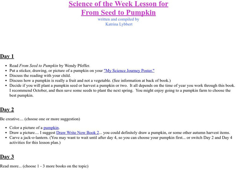 Five day lesson plan uses a variety of resources to cover the book, From Seed to Pumpkin, by Wendy Pfeffer.