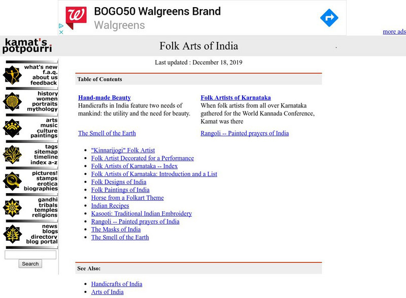 An interesting site filled with much more information and examples than it appears to. Wonderful photos of folk art, hand made crafts, paintings, masks, and various other types of Indian art.
