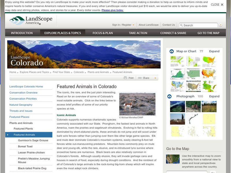 An overview of some of Colorado's most well known animals. This is followed by brief profiles of selected animals including the sage-grouse, boreal toad, lynx, prairie chicken, jumping mouse as well as endangered fish and butterflies of...