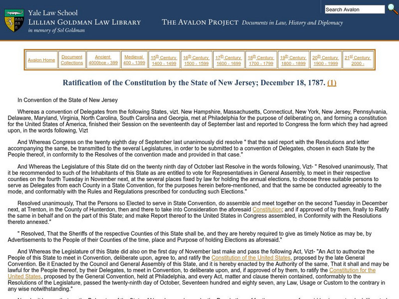 Avalon Project: Ratification of the Constitution by the State of New Jersey