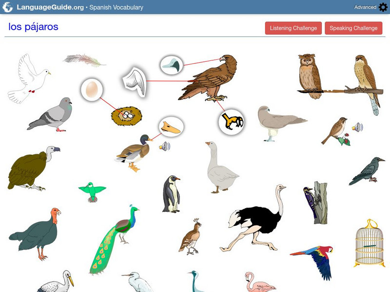 Colorful pictures display birds of all kinds. You can hear the correct Spanish pronunciation and see the correct spelling by dragging your mouse over the picture.