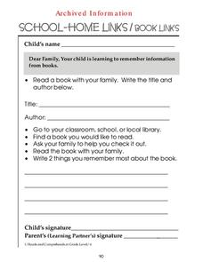 For this reading a book at home worksheet, 1st graders choose a book to read at home with a family member and then list 2 things they remember most about the book.