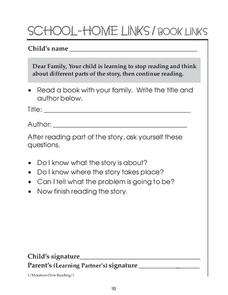 In this reading a book at home worksheet, 1st graders choose a book to read with a family member at home and then answer 1 short answer question on the lines provided.