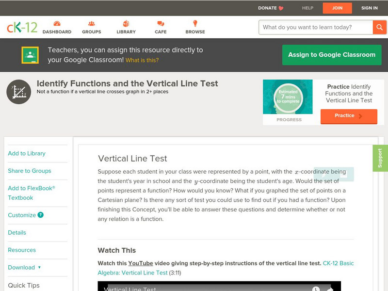[Free Registration/Login may be required to access all resource tools.] In this lesson students determine if a given relation or graph is a function. Students watch a video tutorial, examine guided notes and attempt practice problems.