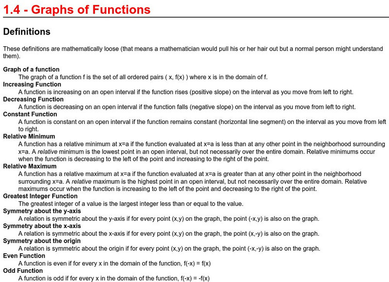 This site from the Richland Community College provides graphs of Functions offers loose definitions of many terms relative to the graphing of functions.