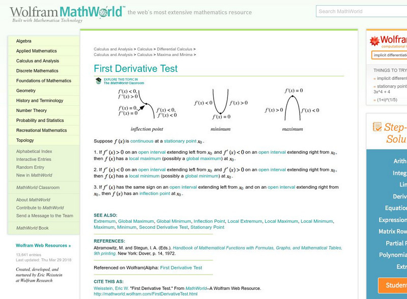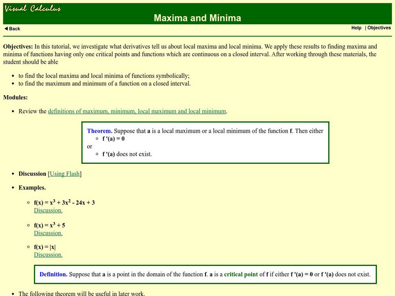 Very good site explaining the maxima and minima. The site has examples and definitions along with links to help the student through the process.