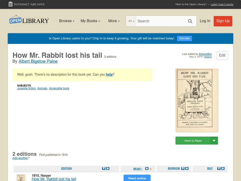 This ebook version of Albert Bigelow Paine's How Mr. Rabbit Lost His Tail has been made available in multiple formats by the Open Library. Editions of the full novel, organized by year of publication, may be accessed here.