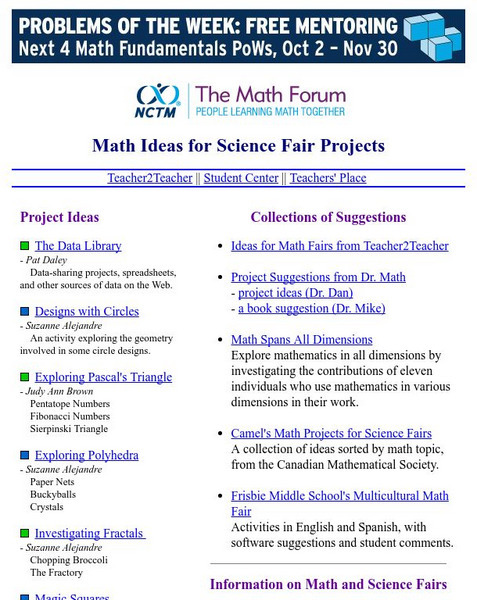 Math Forum provides a list of possible math science fair topics with links to each topic to get an idea of what will be studied and suggested questions to answer. This site also contains links to teacher discussions on Math Fairs.