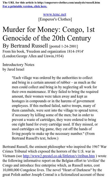 Read about the role of King Leopold of Belgium in the colonization of the Belgian Congo and the extreme exploitation of the people living there in a vivid portrayal by Bertrand Russell.
