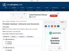 In this antonyms and synonyms worksheet, students review and analyze eighteen sets of words and choose whether they are antonyms or synonyms.