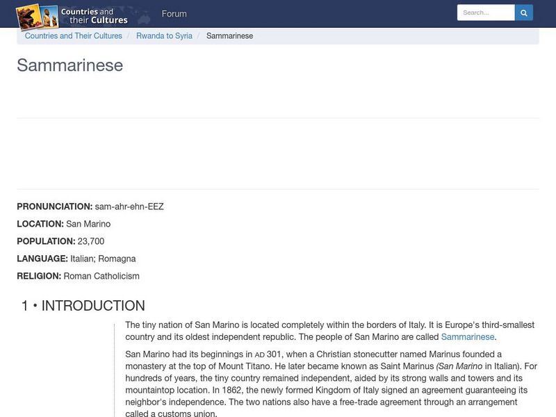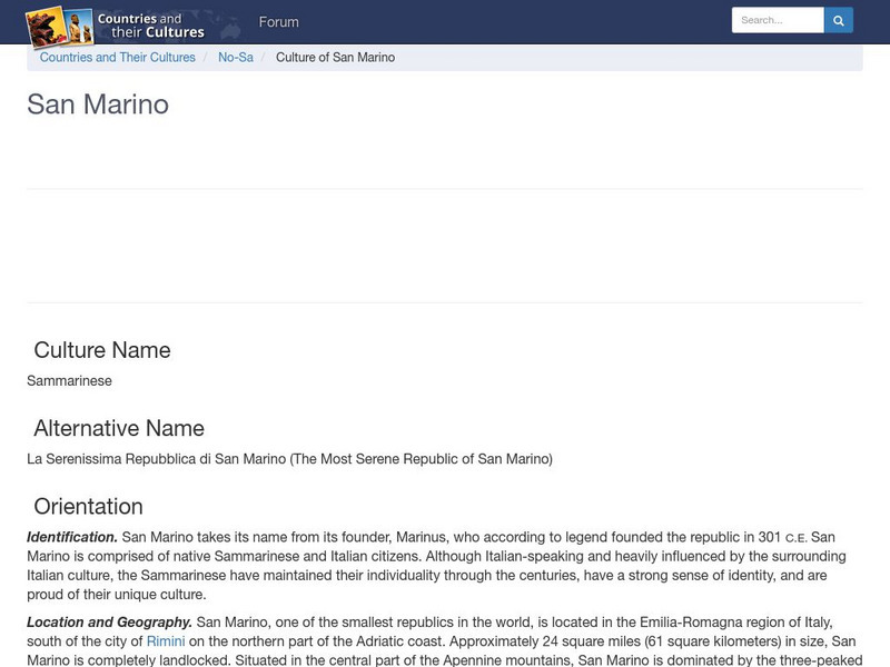 Provides an overview of the culture of San Marino. Gives basic information on topics such as geography, ethnic makeup, languages, symbolism, economy, food, customs, social stratification, family life, education, religion, politics, etc....