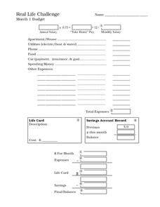 In this consumer mathematics worksheet, students complete one month of budgeting by completing each of the statements with the appropriate information. Then they calculate their total expenses for the month minus their savings account...