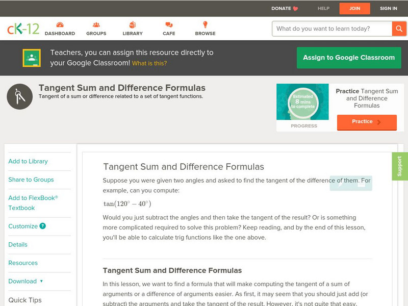Ck 12: Trigonometry: Tangent Sum and Difference Formulas
