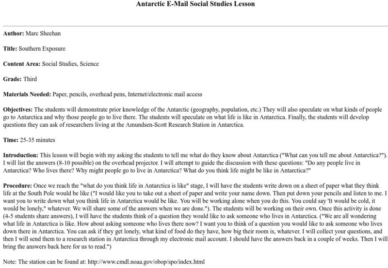 Why would you ever want to go to Antarctica? This lesson plan allows the students to imagine what life would be like at the bottom of the earth. The teacher can then e-mail the South Pole Observatory for answers to their questions.