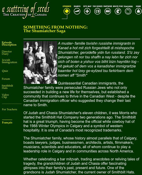 The Shumiatcher family, Russian Jews who emigrated to Canada in the early 1900's, grew to become successful business owners and professionals. This site outlines their history and details the making of a television documentary.