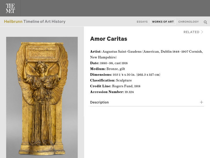 From the Metropolitan Museum of Art this Victorian era neo-classically inclined bronze sculpture "Amor Caritas" by the American artist Augustus Saint-Gaudens. The sculpture is presented as an enlargeable image with a description and...