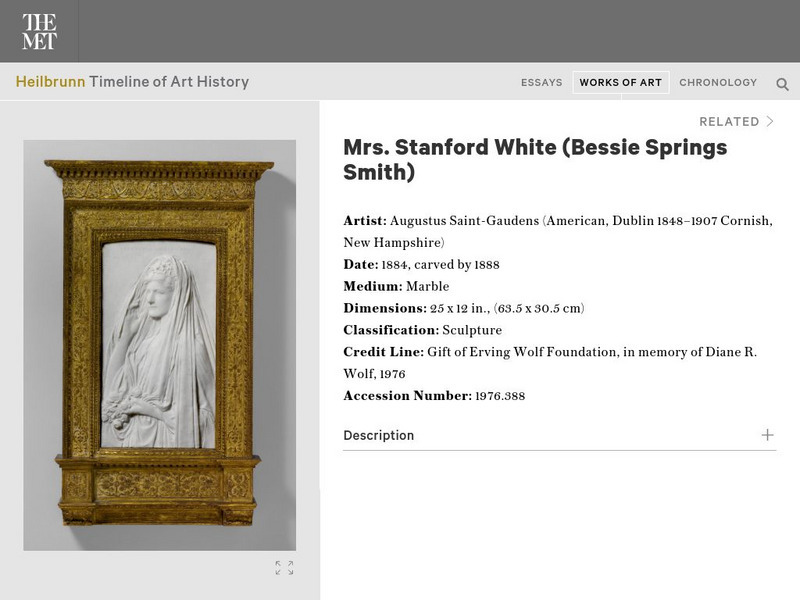 From the Metropolitan Museum of Art this Victorian era neo-classically inclined marble relief sculpture "Mrs. Stanford White (Bessie Springs Smith)" by the American artist Augustus Saint-Gaudens. The sculpture is presented as an...