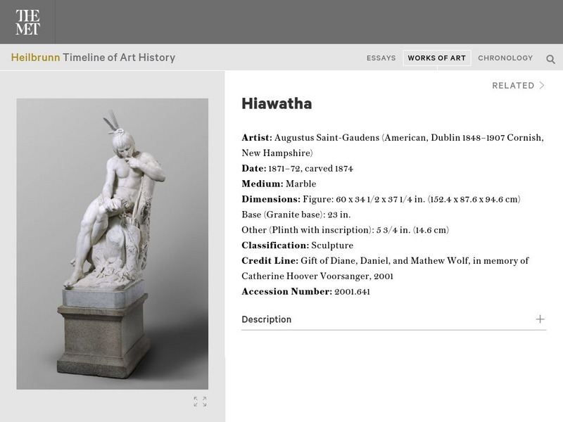 From the Metropolitan Museum of Art this Victorian era neo-classically inclined marble sculpture "Hiawatha" by the American artist Augustus Saint-Gaudens. The sculpture is presented as an enlargeable image with a description and lonks to...