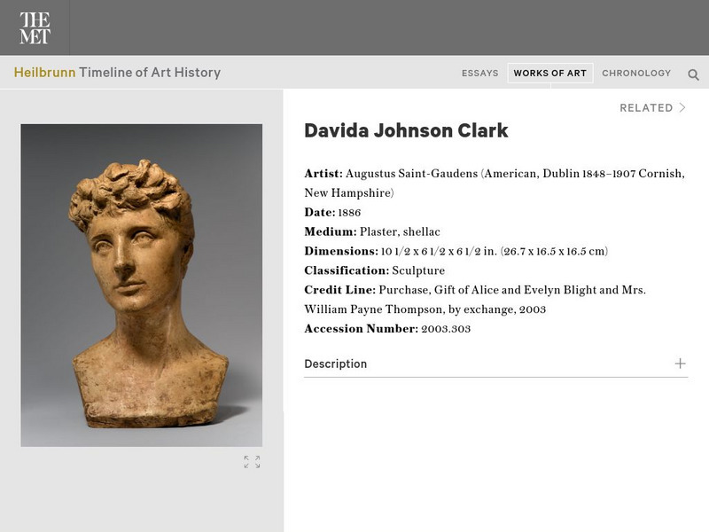 From the Metropolitan Museum of Art this Victorian era neo-classically inclined plaster sculpture "Davida Johnson Clark" by the American artist Augustus Saint-Gaudens. The sculpture is presented as an enlargeable image with a description...