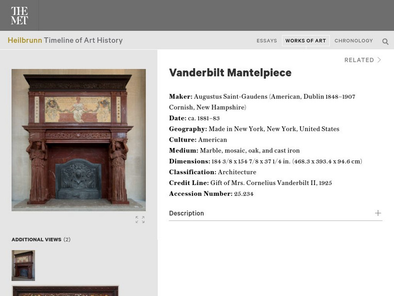 From the Metropolitan Museum of Art this Victorian era neo-classically inclined sculptured mantelpiece "Vanderbilt Mantelpiece" by the American artist Augustus Saint-Gaudens. The mantelpiece is presented as an enlargeable image with a...