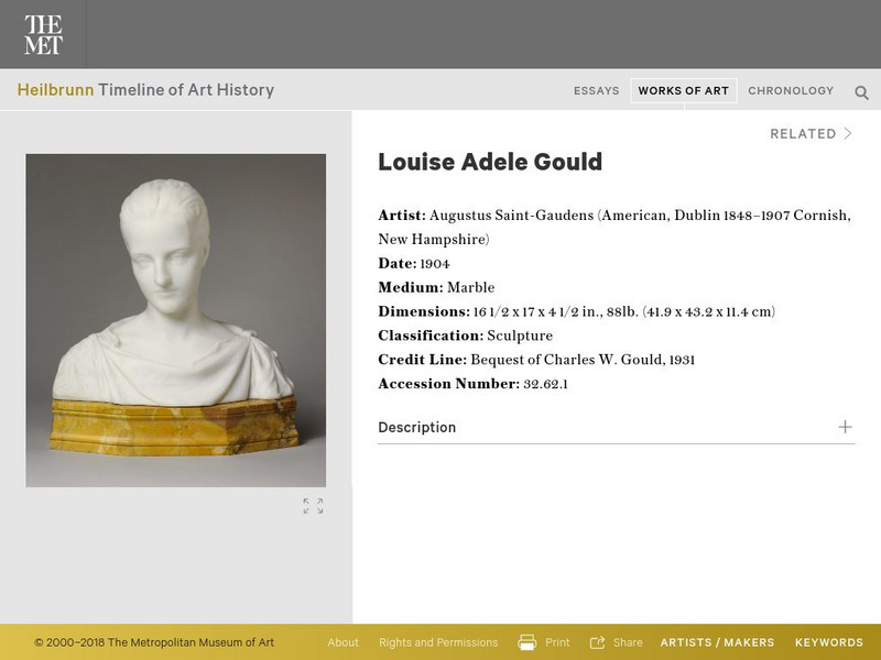 From the Metropolitan Museum of Art this Victorian era neo-classically inclined marble sculpture "Louise Adele Gould" by the American artist Augustus Saint-Gaudens. The sculpture is presented as an enlargeable image with a description...