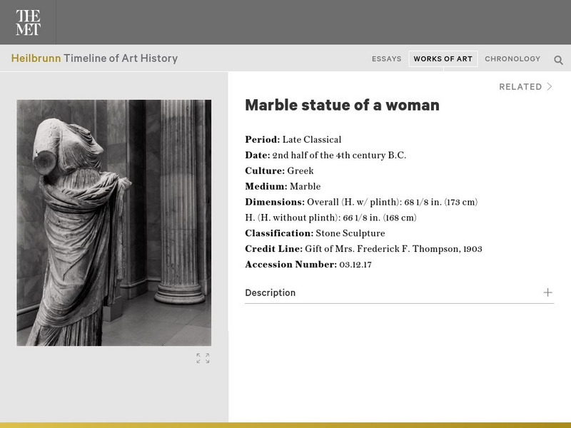 From the Metropolitan Museum of Art this page details the 4th century Greek sculpture "Statue of a woman " with a description and images of the piece.