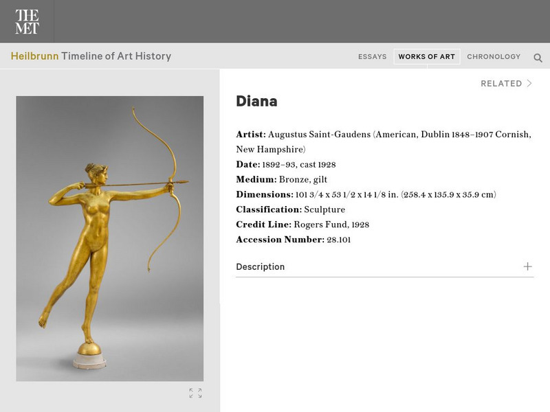 From the Metropolitan Museum of Art this Victorian era neo-classically inclined bronze sculpture "Diana" by the American artist Augustus Saint-Gaudens. The sculpture is presented as an enlargeable image with a description and lonks to...