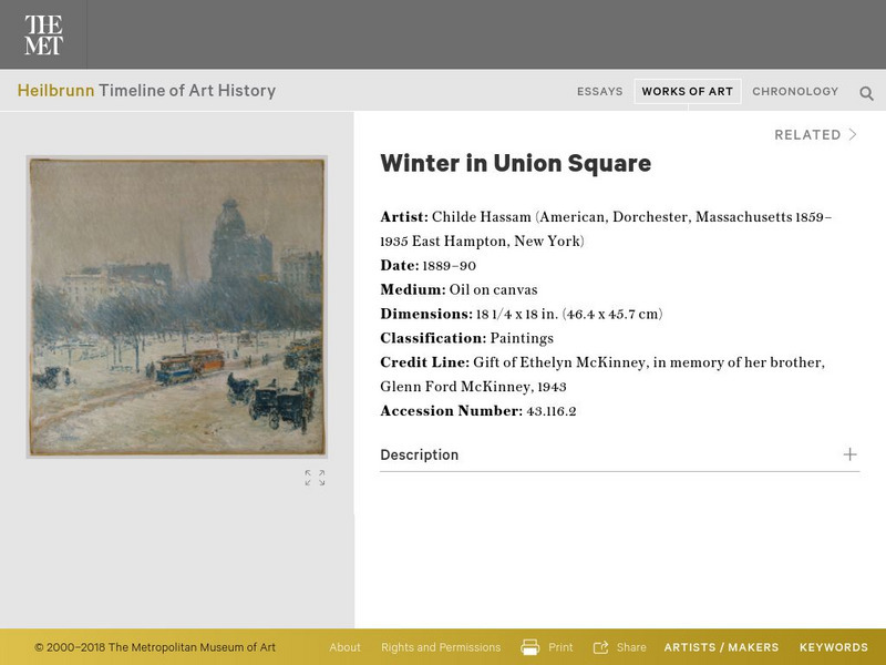 From the Metropolitan Museum of Art the painting "Winter in Union Square" by the American impressionist painter Childe Hassam is profiled with a large image of the piece, a description, and links to related topics and artworks.