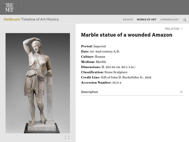 From the Metropolitan Museum of Art this page details the 1st century A.D. Roman sculpture "Statue of a wounded Amazon" with a description and images of the piece.