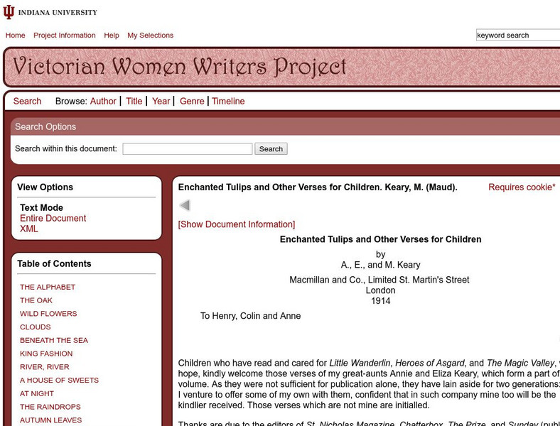 A collection of poems for children. Compiled in print by Maud Keary, it is presented here by Indiana University in electronic form.