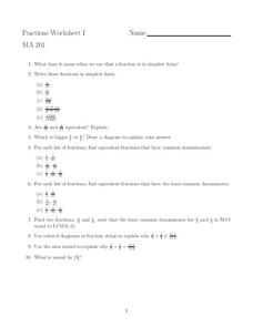 In this math worksheet, students solve fraction problems. Students find equivalents, use common denominators, and explain their answers.