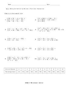 In this rational expressions worksheet, 9th graders solve 10 different problems that include adding and subtracting various fractional expressions. First, they determine the least common denominator for each one. Then, students add the...