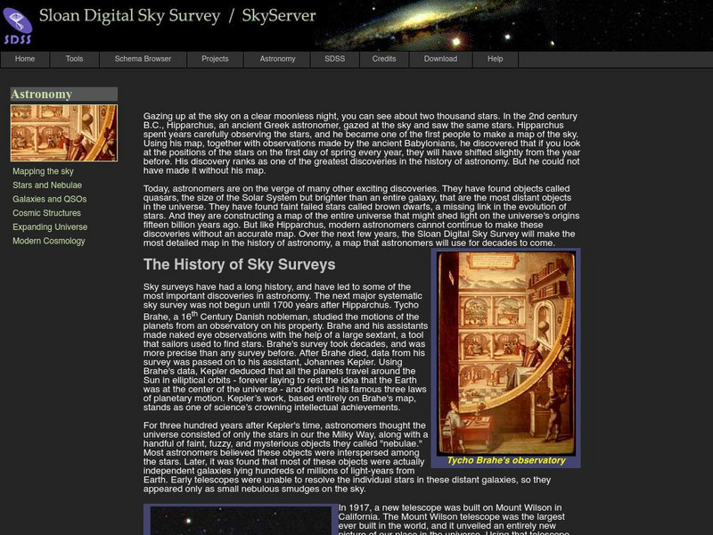 This site from SkyServer provides the history of astronomy as well as links to mapping the sky, galaxies, cosmic structures and much more. Several pictures are given, and the article is medium in length.