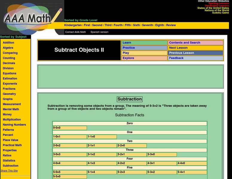 The learning game review subtraction facts. Players pop balloons to solve the subtraction problems.