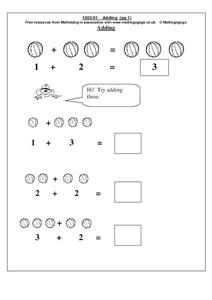 In this addition learning exercise, students find the sum of 3 beach ball addition problems involving single digit whole numbers. Students write their answers in the boxes provided.