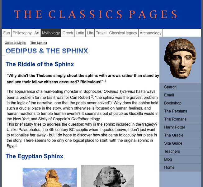 An essay about the significance of the sphinx in "Oedipus the King," the tragedy by Sophocles. The essay begins with an examination of the Great Sphinx at Giza, discussing its appearance, age, and likely purpose.