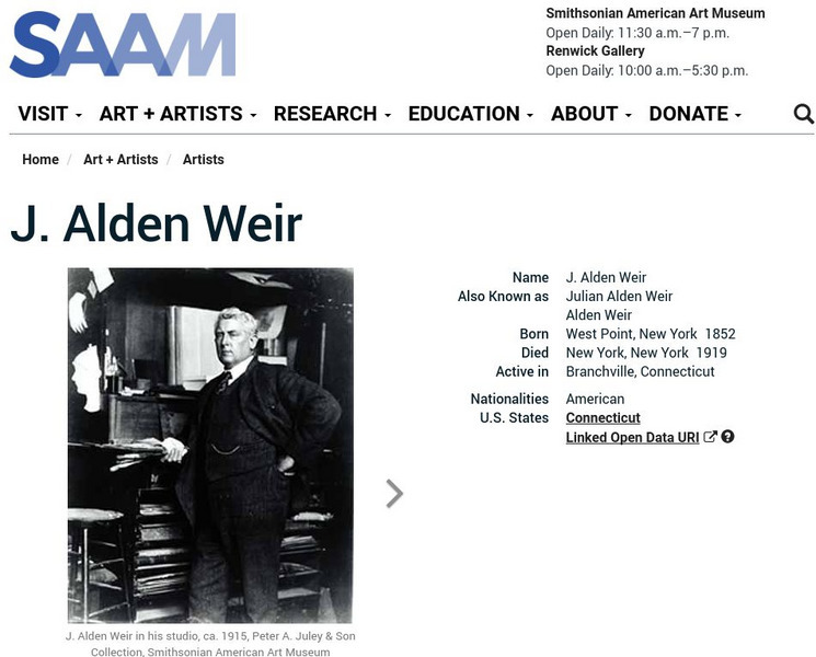 As part of the Smithsonian Art Museum's database of artists, this site provides biographical information on J. Alden Weir in addition to an extensive listing of his works as displayed at the museum.