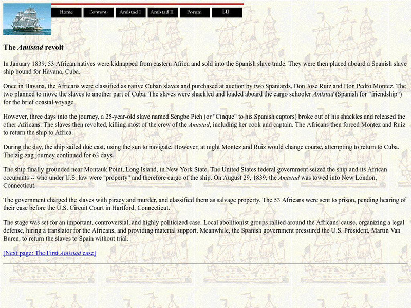 This site from the Cornell University School of Law provides a brief description of what happened during the Amistad Revolt and gives details concerning the Supreme Court that followed.