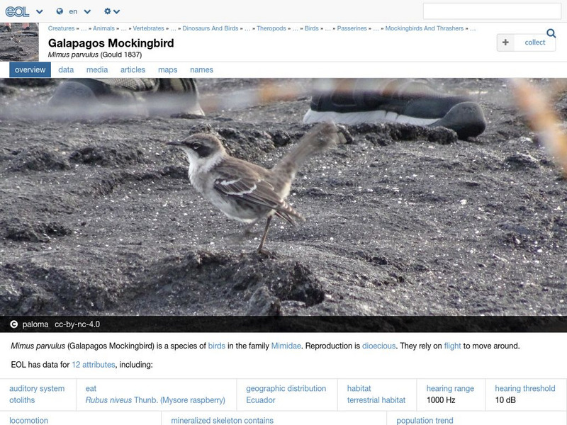 The Encyclopedia of Life presents this in-depth overview of Galapagos Mockingbirds (Nesomimus parvulus), including their habitats, size, conservation status, and much more. Images of this species and maps of its global distribution can...