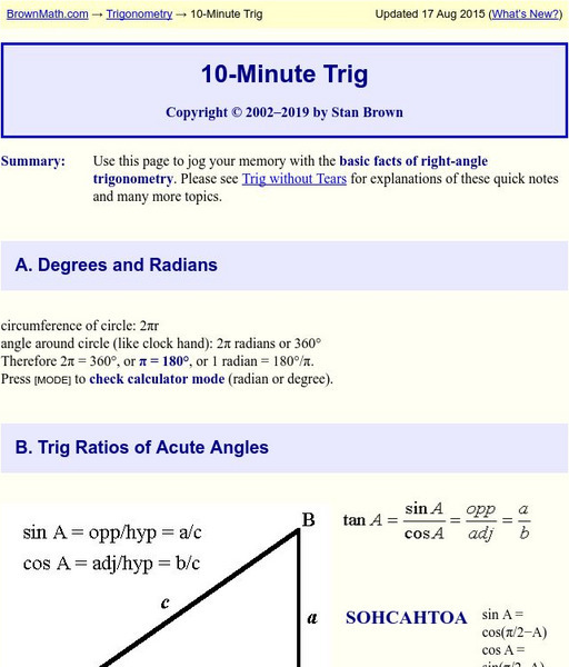 Looking for a 10-minute review of the major concepts of trigonometry? This site is a quick recap of degrees and radians, SOH CAH TOA, Pythagorean identities, and special right triangles are all found here.