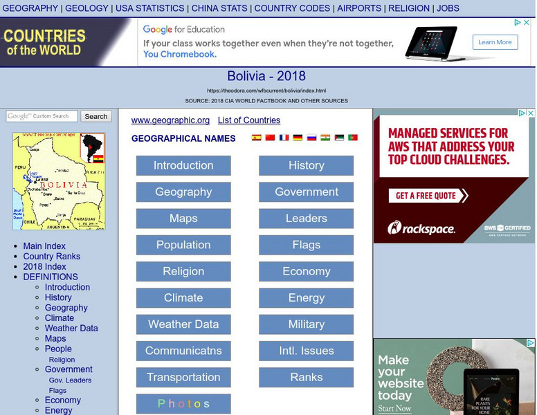Presents many general country specific facts about Bolivia in a well organized chart form. This site is enriched by links to maps and an image of the Altiplano salt flats.