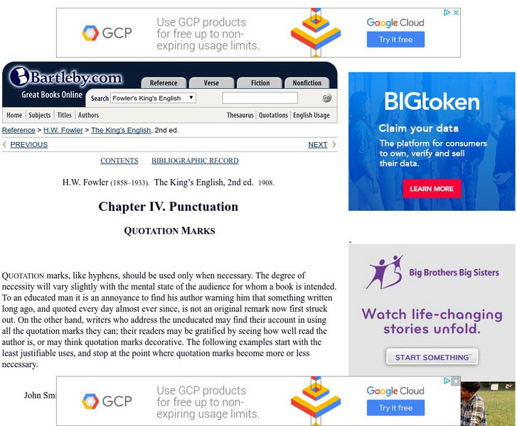 The proper use of quotation marks is explained and shown with examples in this excerpt from H.W. Fowler's The King?s English, 2nd ed. (1908), a writing primer used in the early 20th century.