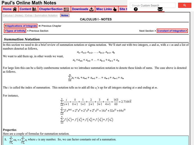 The tutorial reviews summation notation. Topics discussed are the properties and formulas for summation notation. Class notes, definitions, and examples with detailed solutions are included. The notes are available in pdf format.