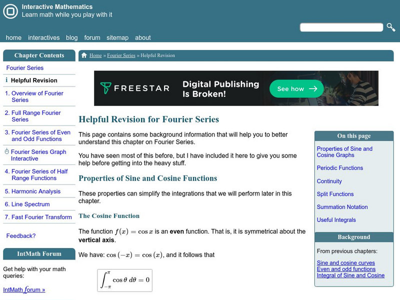 Begin your studies of the Fourier Series with this lesson. It contains information on all of the essentials of getting started, including trigonometric functions, continuity, periodic functions, and more.