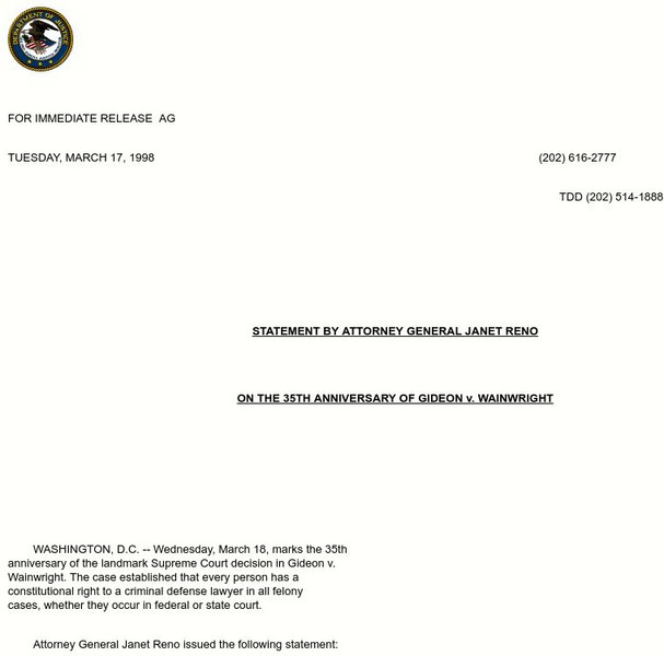 Statement by Attorney General Reno on 35th Anniversary of Gideon v. Wainwright