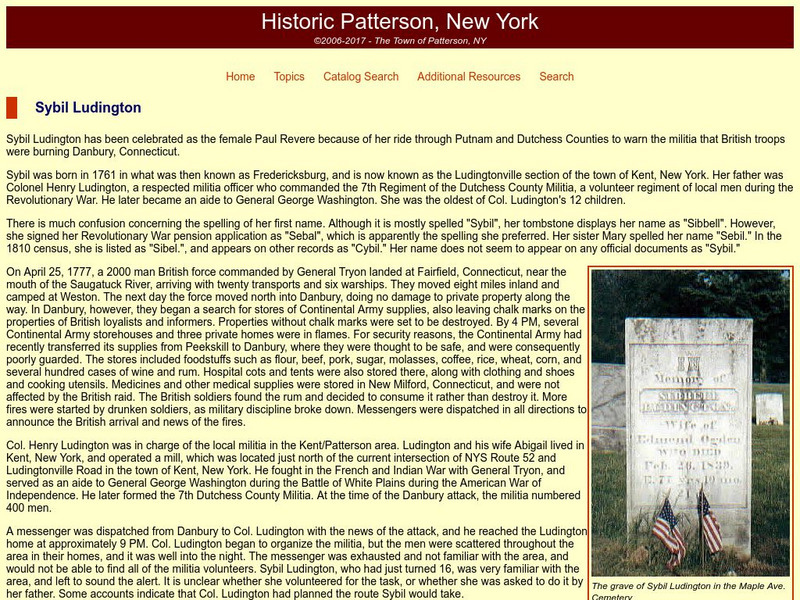 A short biography of Sybil Ludington, known as the female Paul Revere. Sybil helped her father alert his troops of the attack on Danbury during the Revolutionary War.