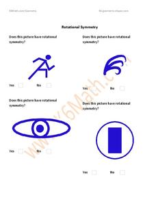 In this symmetry worksheet, students analyze 4 pictures. Students determine if each picture has rotational symmetry and mark "yes" or "no". There is no definition for this term and no example.