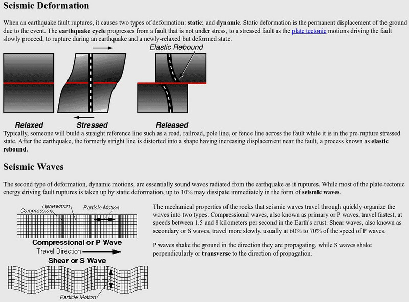 This resource describes the two different types of seismic waves and how they travel through the earth, offers diagrams of the waves, their speeds, and how seismograms are used to locate earthquakes.