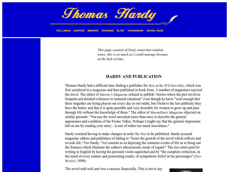 This is a good website to accompany a reading of Thomas Hardy's novel, "Tess of the d'Urbervilles." Read about Thomas Hardy's life and career, the novel's plot and characters, and the novel's themes and important symbols.